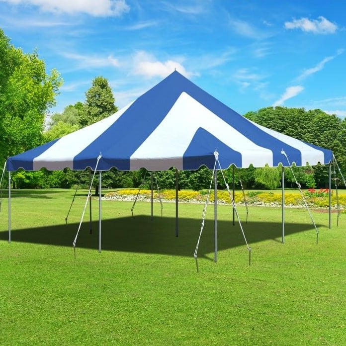 This 20' x 20' Pole Tent in Blue & White is an excellent addition to any corporate or special residential event. Its versatile use is ideal for your outdoor events like weddings, graduations, church functions and reunions etc. This generously sized 20' x 20' can accommodate 30-40 guests for a sit-down dinner, 50 guests for a cocktail party. It covers approximately 400 square ft. and requires a 30 x 30 installment area as pole tents are strapped down at an angle.