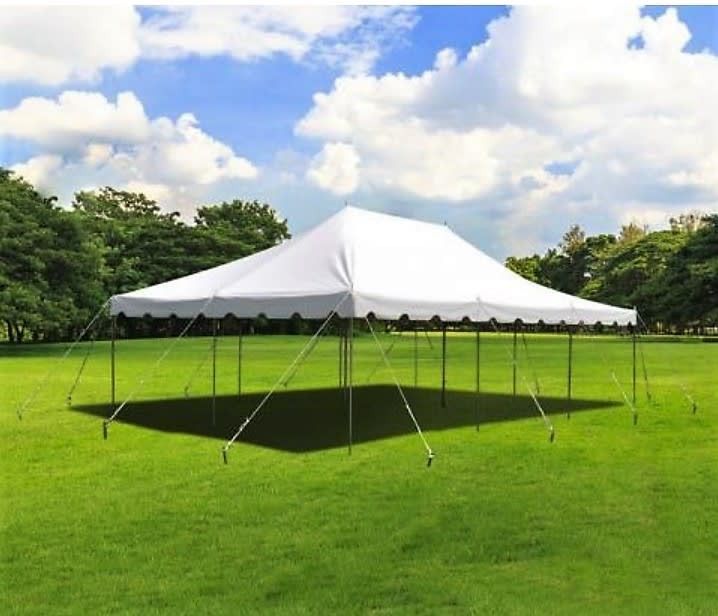 This 20' x 20' Premium Pole Tent in White is an excellent addition to any corporate or special residential event. Its versatile use is ideal for your outdoor events like weddings, graduations, church functions and reunions etc. This generously sized 20' x 20' tent can accommodate 30-40 guests for a sit-down dinner or 50 guests for a cocktail party and covers approximately 400 square ft. This particular tent requires a 30 x 30 installment area, as pole tents are strapped down at an angle.