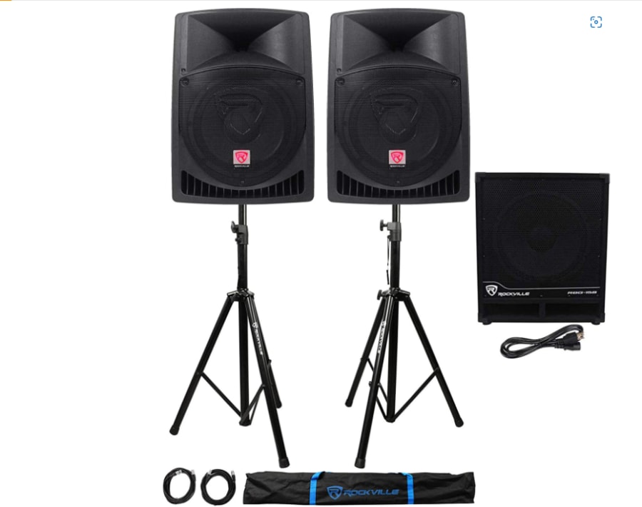 Package Includes: (2) Rockville RPG15 15" Powered Active 2-Way DJ PA Speakers Totaling 1600W. (1)RockvilIe RBG15S 15" 1600w Active Powered PA Subwoofer w/DSP (not included) + Limiter Pro/DJ. (1)Pair of RockvilIe Adjustable Tripod Speaker/Light Stands+(2) 20 Foot XLR Cables. Features: RockvilIe RPG12 15" Active/Powered 800 Watts DJ/PA Speaker System. 200-Watt RMS / 400 Watts Program Power / 800 Watts Peak